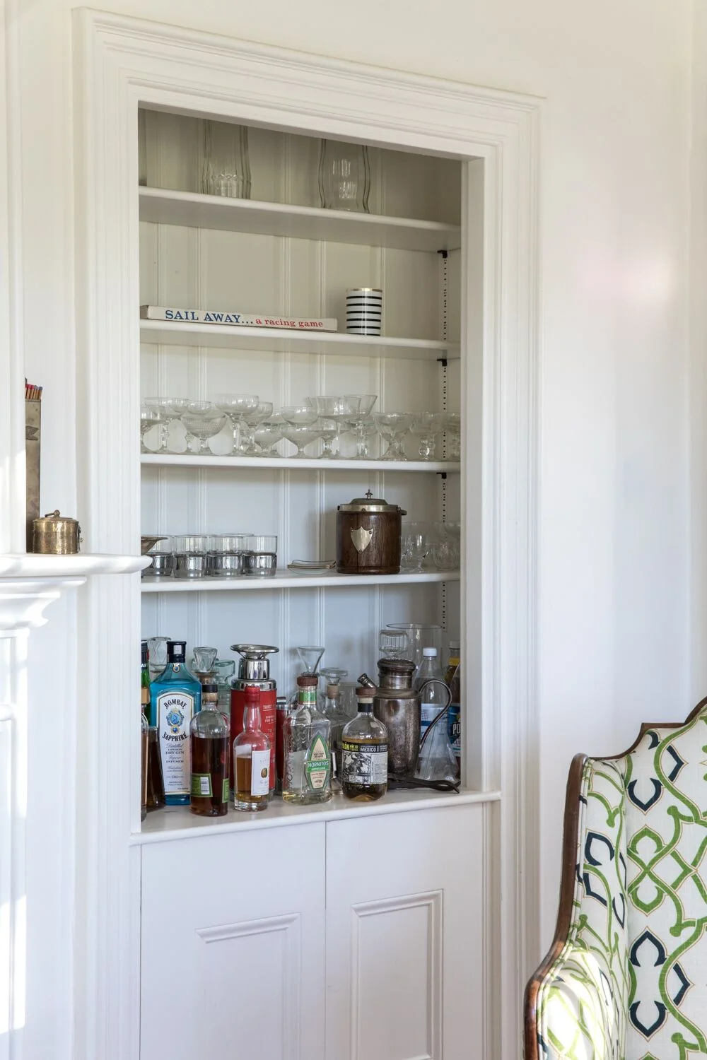 SARAH: One day I found an antique biscuit basket, which was so perfect for Tops’l. It's wood and tarnished metal, and it’s insulated so I use it as an ice bucket. On that same day, I found vintage cocktail glasses that have these '70s silver inserts. I have an issue with vintage cocktail-ware. Estate sales always have so much glassware. If we ever need martinis for 200 people, we're all set.