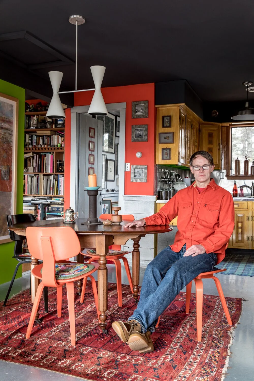 Dan Dowd is one of those mysteriously located, incredibly talented artists in Maine. Living in a small town on the coast with a little over 2,000 people, down a long dirt road that winds around until you see his orange painted stumps and metal-sided house on the hill, he has crafted a unique and fascinating space out of a dated seasonal home with views of the water. The interior is curated like a mix between a fun house and an art gallery. Always paying attention to budget, detail, humor, and style—Dan creates both artwork and intentional living space. His inventive and resourceful ways have remained constant throughout both, as well.