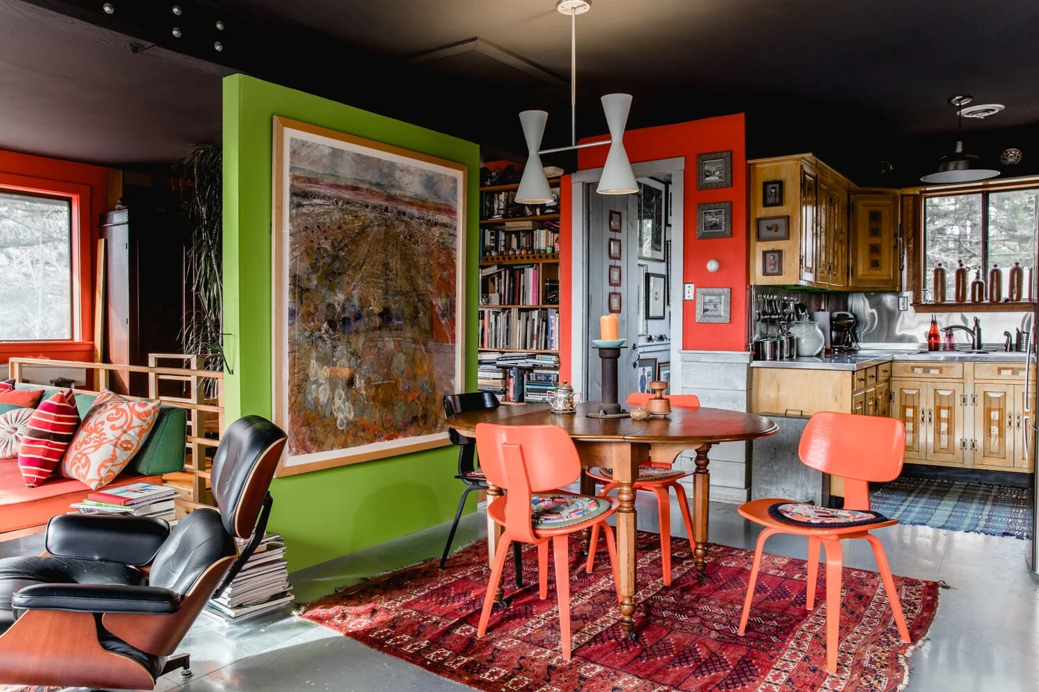My kitchen table is a solid walnut 19th century drop-leaf, it is next to a mahogany Empire buffet (the first piece of furniture I purchased for $50 in 1986) that holds found rusted automobile springs, Italian maiolica, my grandparents gingerbread kitchen clock, and tropical house plants. A large 20th century landscape made by a friend is on the opposite wall. Hanging overhead is a white spun aluminum mid-century light fixture. The vintage mid-century Thonet kitchen chairs were given to me by a friend. I repainted one glossy black and the other three a bright orange/red. Multi-colored circular "granny cushions" sit on the seats.