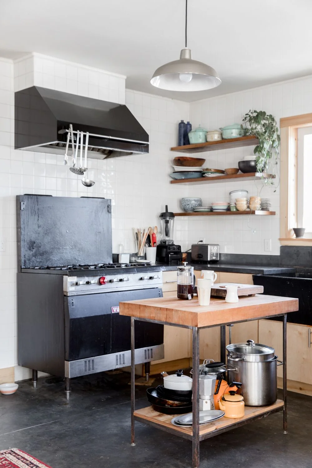 EMILY: The only thing we buy new is pottery from our friends Meghan Flynn and Ariela Nomi Kuh, everything else we salvage (except our mattress, those should always be new). Our sink is probably our favorite piece in the home. We found it in Searsport at a Place called the Trash and Treasures Barn. It’s five feet long, so we had to change our kitchen plans, but I’m so glad we did. Everything in our house has a weird little story about how we got it. The orange chair used to be mustard polyester; we found it on the side of the road and I recovered it with cotton velvet from Mardens. The Vulcan range used to be in Amalfi in Rockland but had been sitting in a barn for about 10 years, so we restored that. The hoosier cabinet came out of the home of one of our first big consignors. The monson slate box next to the couch is an as of yet unidentified piece that Ben dug out of the woods in Swanville. The clawfoot tub was saved from the dumpster at an inn in Camden and restored along with both bathroom sinks.