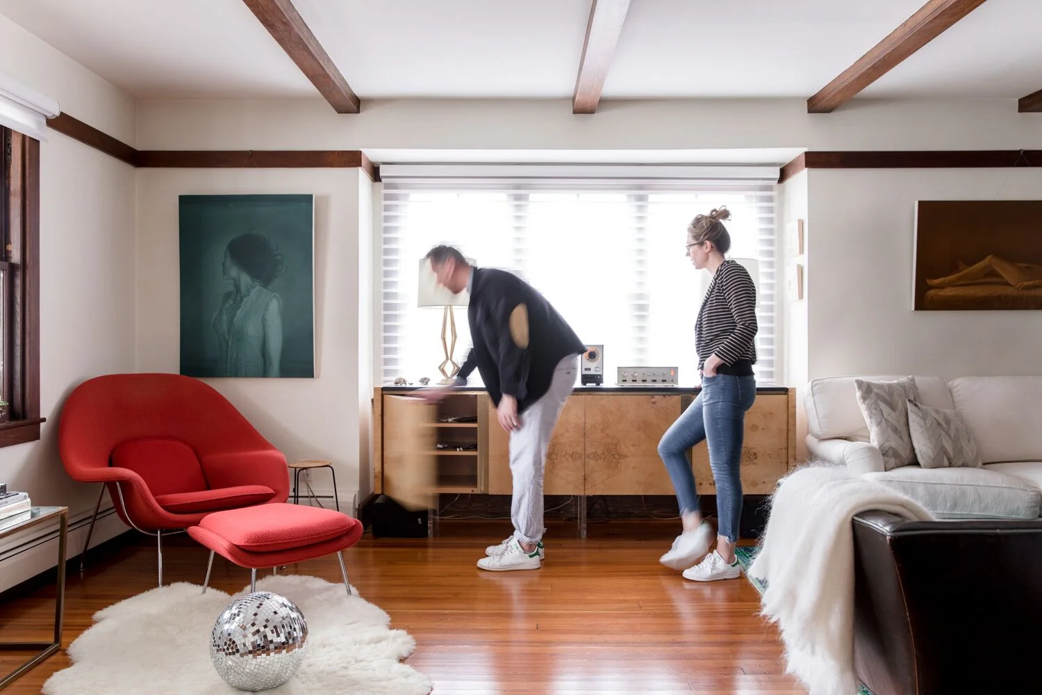 "I LOVE the credenza—it's supposedly a Kagan—in our living room that our record player sits on. We actually bought it off the people we rented from in between this house and our last. They were moving to New York City, and it was too heavy for them to move. The Lucite legs make it look like it’s floating."